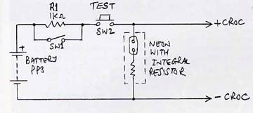 Questo circuitino serve a rilevare eventuali spire in corto in un trasformatore od in un'induttanza. È noto che anche una sola spira in corto, riscaldandosi fortemente a causa della forte corrente che ci circola quando è in corto, oltre ridurre le prestazioni del trasformatore, lo può distruggere. Con questo circuito si inserisce per un istante una pila sul circuito ed al rilascio, se tutto è OK, per le extratensioni generate, il neon lampeggia. Il trasformatore deve avere il secondario scollegato dal carico. Se si rilevano spire in corto il neon non si accende. Nello schema è prevista l'inserzione di una resistenza da 1000 ohm quando si provano le induttanze. Si può usare per trasformatori di alimentazione, di uscita ecc. (Carlo Bramanti)