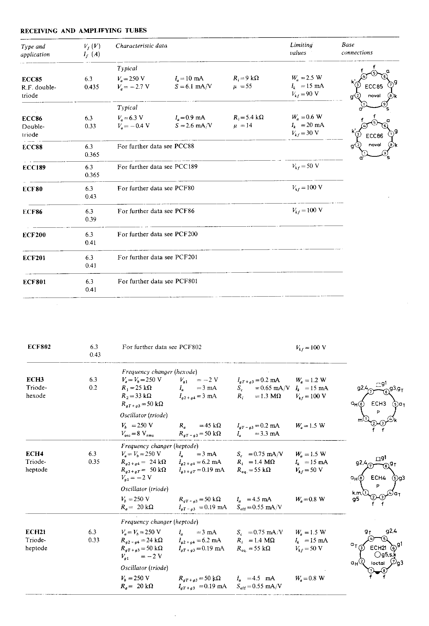 Dati di alcune valvole riceventiQuesti dati sono tratti dal "PocketBook" Philips, edizione 1969. Le valvole qui presentate sono quasi tutte di tipo "europeo", con la sigla che comincia con una lettera. In fondo c'è anche qualche valvola di tipo "americano", con la sigla che comincia con un numero. Se ti servono i dati di una valvola non compresa in questo elenco, siamo a tua disposizione (webmaster@leradiodisophie.it) Torna alla Pagina della Tecnica |