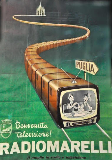 Anni FaLa Televisione, come un treno lunghissimo, unisce l'Italia da Nord a Sud. Dal Duomo di Milano fino allo sperone dello Stivale. Questo era il messaggio portato da questa suggestiva immagine pubblicitaria della Radiomarelli. L'apparecchio riprodotto sembrerebbe essere il modello RV106 (17 pollici) o RV107 (21 pollici) molto simili, entrambi del 1955. Con ben 16 valvole, consumavano la bellezza di 160W e ricevevano un solo canale. Costavano quanto due o tre stipendi di un impiegato medio, e infatti molti il televisore lo acquistavano a rate, con grandi sacrifici. Potete trovare qui il manuale tecnico. In realtà, nel 1955 l'Italia era ancora ben lungi dall'essere unita dal segnale televisivo. Intere regioni erano scoperte, per esempio le Isole; la copertura "totale" avverrà solo alla fine del 1957, grazie a uno sforzo tecnico e finanziario che aiutò a scavalcare gli Appennini e i bracci di mare. Merito anche di trasmissioni come Lascia o Raddoppia, che divenne, come si direbbe oggi, "virale". Si facevano i gruppi di ascolto nei bar e anche nei cinema, oltre che nei salotti della gente ricca appositamente trasformati in mini teatri. Arrivò anche Carosello, con i suoi tormentoni pubblicitari. Fu allora che, per la prima volta, l'Italia si potè considerare "unita": tutti parlavano lo stesso linguaggio, quello della TV. |