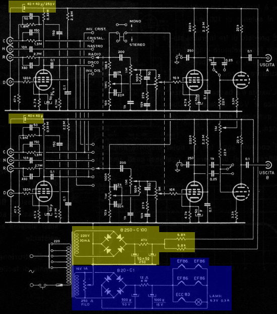 Il raddrizzamento della tensione di placca (in giallo) è a doppia semionda, ottenuto con un ponte di Graetz di rettificatori al selenio (B250 C100). Segue una cella di livellamento Π a resistenza-capacità, costituita da una coppia di capacità elettrolitiche da 50 µF e de un resistore da 47 KΩ. Il valore piuttosto elevato di quest'ultimo non deve stupire in quanto negli apparecchi di preamplificazione l'assorbimento di potenza è modesto e la tensione di placca poco elevata. Quindi il resistore svolge la funzione di prima resistenza di caduta e contemporaneamente garantisce un livellamento eccellente in quanto la tensione di ondulazione si troverà in massima parte ai suoi capi e quasi per nulla sulla bassissima reattanza della capacità elettrolitica, che alla frequenza di rete vale 64 Ω. Immediatamente dopo la linea anodica si sdoppia e attraversa due resistori da 6,8 KΩ, i quali compongono due seconde celle Π (una per canale) in unione ai condensatori da 40 µF disegnati assai lontano negli angoli in alto a sinistra dello schema. La disposizione grafica non è casuale: i testi classici raccomandano sempre di collocare le capacità di filtro nel punto più vicino possibile alla valvola che ne farà uso, idealmente saldandole al suo stesso zoccolo. In questo caso tutte le valvole, ciascuna con l'opportuna resistenza di caduta, impiegano la medesima tensione livellata dalla doppia cella di filtro, ma la valvola che opera in condizioni più delicate di lavoro è la sensibilissima valvola d'ingresso, nei pressi della quale è stata appropriatamente collocata l'ultima capacità di livellamento.