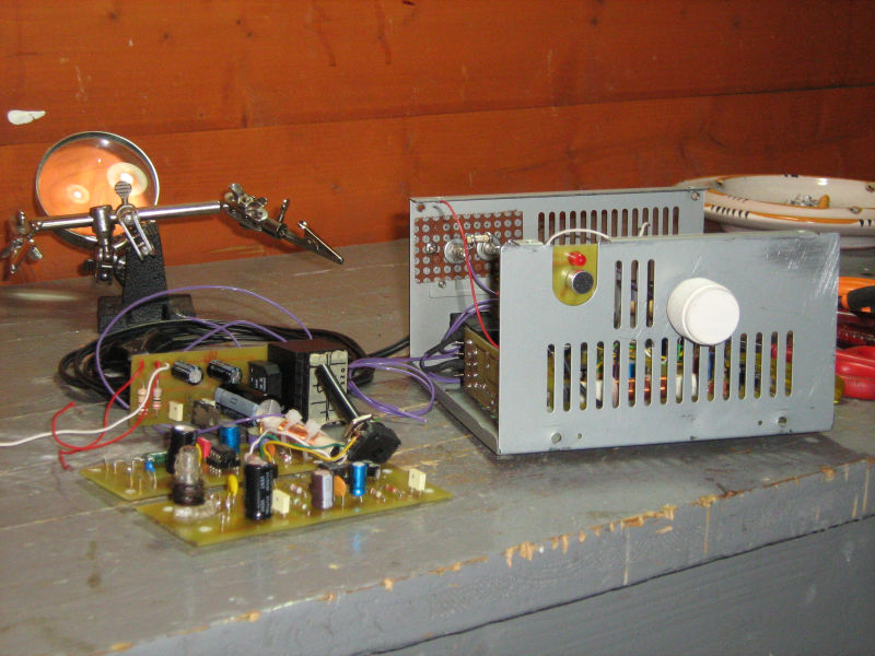 Successivamente ho costruito un ricevitore a galena prendendo spunto dal sito sopracitato e amplificandolo con TBA820M (che avevo in casa). Il primo passo è fatto, riesco a trasmettere musica (lettore CD) da casa a laboratorio, 15 metri. Il passo successivo è stato quello di dotare il TX di un microfono, usando una capsula microfonica a condensatore mettendogli intorno R1, R2, C1, C2 per darle la giusta tensione (3V). Cosi anche la voce viene ricevuta dal ricevitore a galena, regolando opportunamante P1 si imposta il giusto livello al modulatore (LM386) in modo da non avere distorsioni nell'altoparlante. Per l'alimentatore, visto che ho bisogno di due tensioni ho usato un 7812 protetto dalle autoscillazioni da C17, C18 e uno zener da 6,5V polarizzato da R9 per un assorbimento di 70mA circa. Anche su RX e TX ho inserito de filtri per il ripple e antidisturbo C5, C6, C14, C15. Successivamente ho costruito un altro circuito identico RX, TX, ALIM. e qui sono nati i problemi, ma grazie all'aiuto dei "Grixiani" attraverso il forum li ho risolti. Come si nota dallo schema ho inserito un deviatore doppio che commuta alimentazione e antenna da trasmissione a ricezione e contrariamente a come si pensava non provoca disturbi sull'oscillatore T1, L1 non slitta in frequenza e non si spegne nonostante ci sia AP a ridosso dei fili delle antenne a S1. Il led rosso si accende in trasmissione e quello verde in ricezione. La massa del circuito è collegata al contenitore metallico e anche alla presa di terra della rete 220V, nella mia zona ci sono poche abitazioni e non ci sono disturbi nella rete elettrica. Nota particolare a L1, nel primo TX ho usato una vecchia bobina "corbetta" composta da due avvolgimenti, uno da 4 ohm tra AB, l'altro da 1 ohm tra BC, nel secondo TX ho usato una bobina d'antenna di una radio, ho tolto la barretta in ferrite e al suo posto ho messo un supporto cilindrico in pvc fornito di nucleo regolabile (quelli usati per autocostruirsi le bobine) ho fissato l'avvolgimento al supporto con della colla, la soluzione migliore è quella di usare due bobine identiche. Ho usato questo tipo di bobine perchè usando quelle descritte nel sito originale l'oscillatore non vuole saperne di funzionare, spero che qualcuno possa darmi dei chiarimenti. La frequenza di trasmissione è 800/1000Khz. L2 è composta da 70 spire di filo smaltato diametro 0,2mm avvolte su ferrite diametro 8mm lunghezza 6cm. Regolare CV e L1 fino ad ottenere la migliore ricezione. Come antenna esterna ho usato 4 metri di filo diametro 1,5mm, in fase di collaudo il filo d'antenna l'ho steso di un metro, il rimanente l'ho avvolto a matassa e tutto funziona perfettamente a una distanza di 15-20 metri, stendendo tutta l'antenna si arriva a 50 metri. Ho fatto anche una prova che mi ha suggerito r5000, cioè senza commutare l'antenna ma tenendola collegata a TX e avvicinando L1 a L2 si ottiene un ottimo accoppiamento magnetico con ottimi risultati. Il primo RTX è stato inserito in un contenitore di un alimentatore ATX, il secondo in un contenitore di alluminio costruito da me, i PCB li ho disegnati con Fidocad e realizzati col sistema"stira e ammira". Con questo circuito è divertente sperimentare modificando i circuiti di accordo, si imparano molte cose. Qui sotto alcune foto della realizzazione. Ho aggiunto il PCB dell'RX (in alto) bisogna fare una piccola modifica per inserire il compensatore. Mentre il PCB del TX (in basso) ha la predisposizione per un deviatore per commutare microfono o musica. Nelle ultime foto inserite si nota la bobina del TX recuperata da una radio AM e i fili (viola) che commutano l'antenna e non creano nessun disturbo. Inoltre per comodità nel RTX grigio ho dotato il microfono di un cavetto schermato per non doversi avvicinare troppo all'apparecchio per parlare, cosa che non ho fatto per l'altro RTX. Il PCB dell'alimentatore l'ho disegnato direttamente sul rame vista la sua semplicità. (clicca sulle singole immagini per ingrandirle)